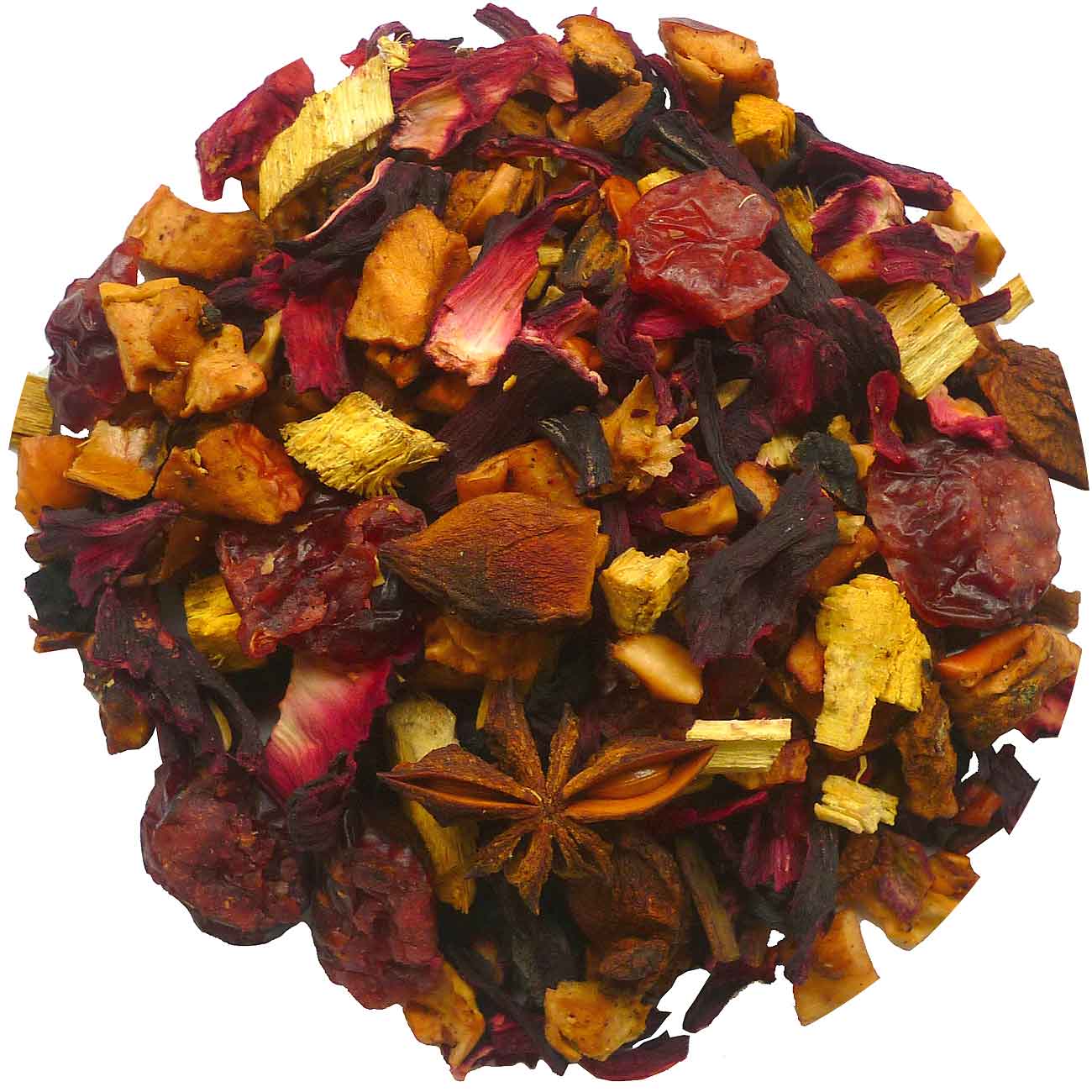 Een fruitige en kruidige melange van appel, cranberry, kaneel, steranijs en hibiscus. Zoet, warm en aromatisch – perfect voor een knus moment vol winterse gezelligheid.