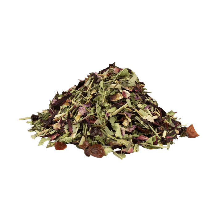 Hibiscusbloemen*, rozenbottelschillen*, citroengras*, citroenverbena*, krulmuntbladeren*, brandnetelbladeren*, rozenblaadjes*. *Uit gecontroleerde biologische teelt.