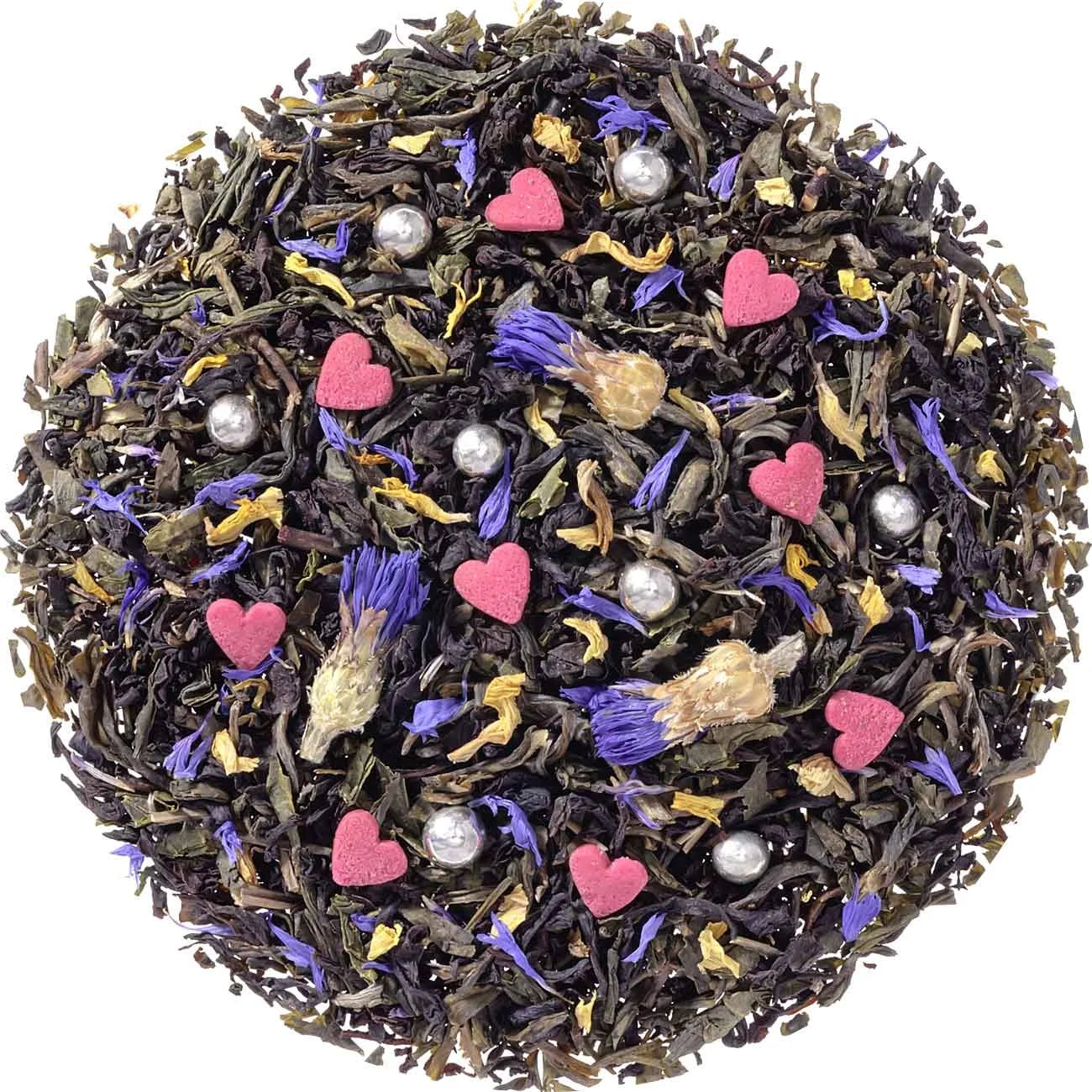 Vier het leven met Celebration Thee, een verfijnde melange van groene, zwarte en witte thee. Deze harmonieuze blend wordt verlevendigd door sprankelende suikerparels en hartjes die een subtiele zoetheid en feestelijke uitstraling toevoegen. Korenbloem- en zonnebloemblaadjes zorgen voor een frisse, bloemige toets en een elegante presentatie. Elke slok is een klein moment van vreugde – perfect om bijzondere gelegenheden of dagelijkse genietmomenten te vieren.