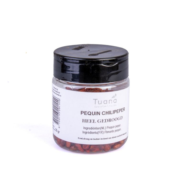 De Pequin chilipeper is een kleine, gedroogde peper met een indrukwekkende kick. Met een pittigheid die 5 tot 10 keer heter is dan een jalapeño. Voeg deze peper direct intensiteit toe aan je gerechten. Zijn smaakprofiel is rokerig, fruitig en licht citrusachtig – perfect voor salsa’s, stoofschotels, sauzen en marinades. Gebruik spaarzaam: een klein beetje is genoeg om een groot verschil te maken. Pequin pepers zijn populair in de Mexicaanse keuken, maar passen ook verrassend goed bij Aziatische en Zuid-Amerikaanse gerechten.