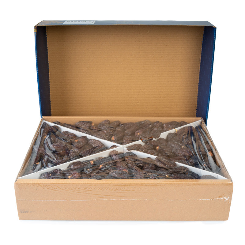 Safavi dadels uit Saudi-Arabië staan bekend om hun diepe donkere kleur, zachte bite en aangenaam zoete smaak. Deze premium dadels hebben een licht stevige structuur met een rijke, volle afdronk, waardoor ze geliefd zijn bij echte dadelliefhebbers. Safavi dadels worden vaak gewaardeerd om hun authentieke karakter en natuurlijke zoetheid, en zijn een mooie aanvulling tijdens de Ramadan of op elk moment dat je wilt genieten van een kwalitatieve, pure dadelsoort. Zorgvuldig geselecteerd en verpakt in een royale 5 kg doos.