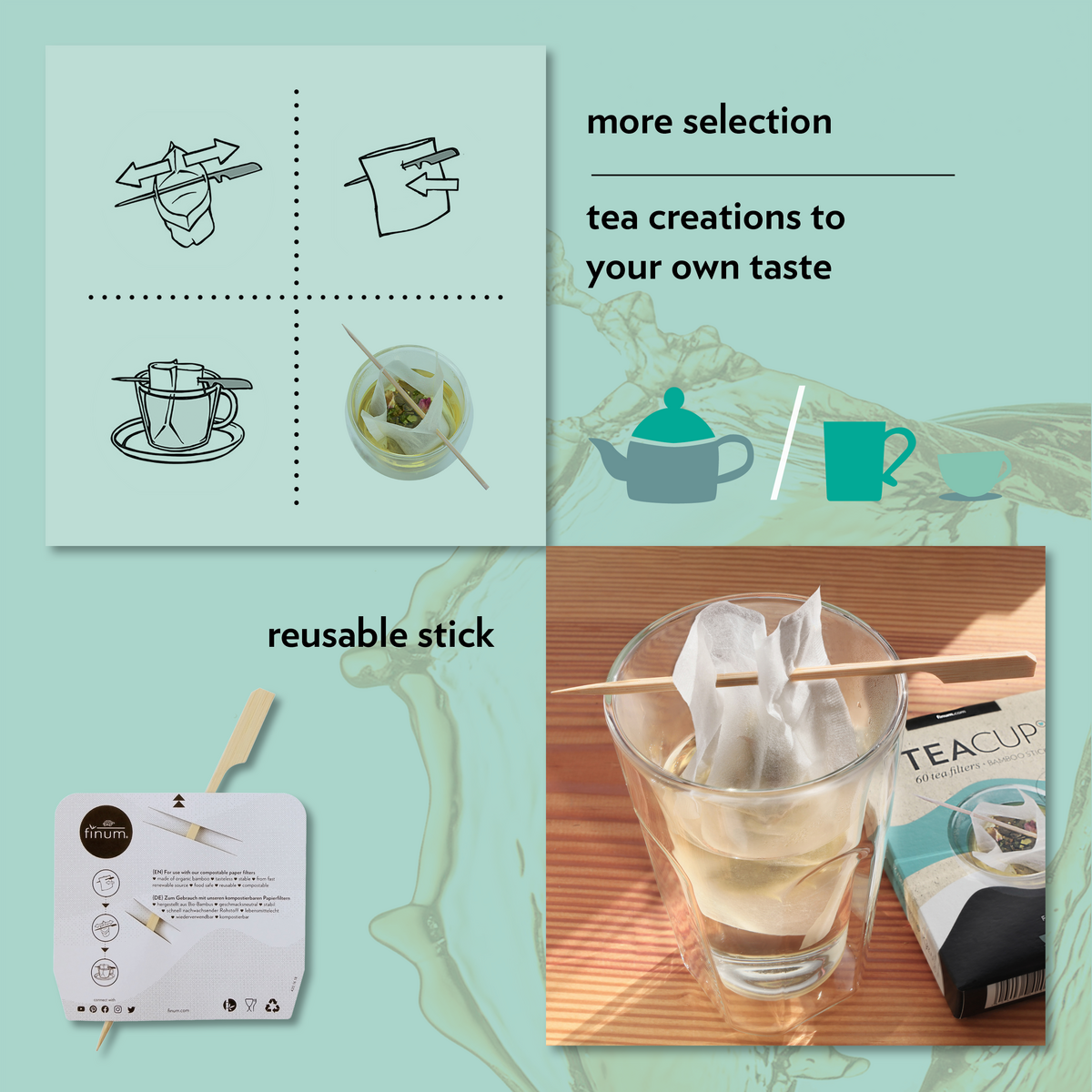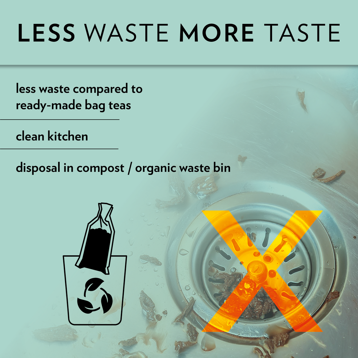 Theefilters zijn gemaakt van composteerbaar naturfine-papier, dat voor 100% uit natuurlijke vezels bestaat en FSC-gecertificeerd is. MEER SMAAKDeze filters zorgen voor een echte smaakextractie.Geniet van het volle aroma en de fijne kleur van je favoriete thee met de TEACUP-filters. MEER KEUZES Het kiezen van de juiste losbladige thee blijft aan jou. Maak je eigen mix van thee en kruiden met TEACUP-filters. MINDER AFVALDe uitgebreide verpakking van theezakjes resulteert in een materiaal- en CO2-voetafdruk die bijna x keer hoger is dan die van losse thee. TEACUP-filters zijn gemaakt van composteerbaar naturfine®-papier en verpakt in gerecycled doosmateriaal. De filters en de doos zijn FSC®-gecertificeerd. MINDER KOSTEN Theezakjes ondergaan veel meer verpakkingsprocedures dan de losbladige thee. Dit heeft ook impact op de kosten. Met TEACUP-filters bespaart u op prijs, niet op kwaliteit.