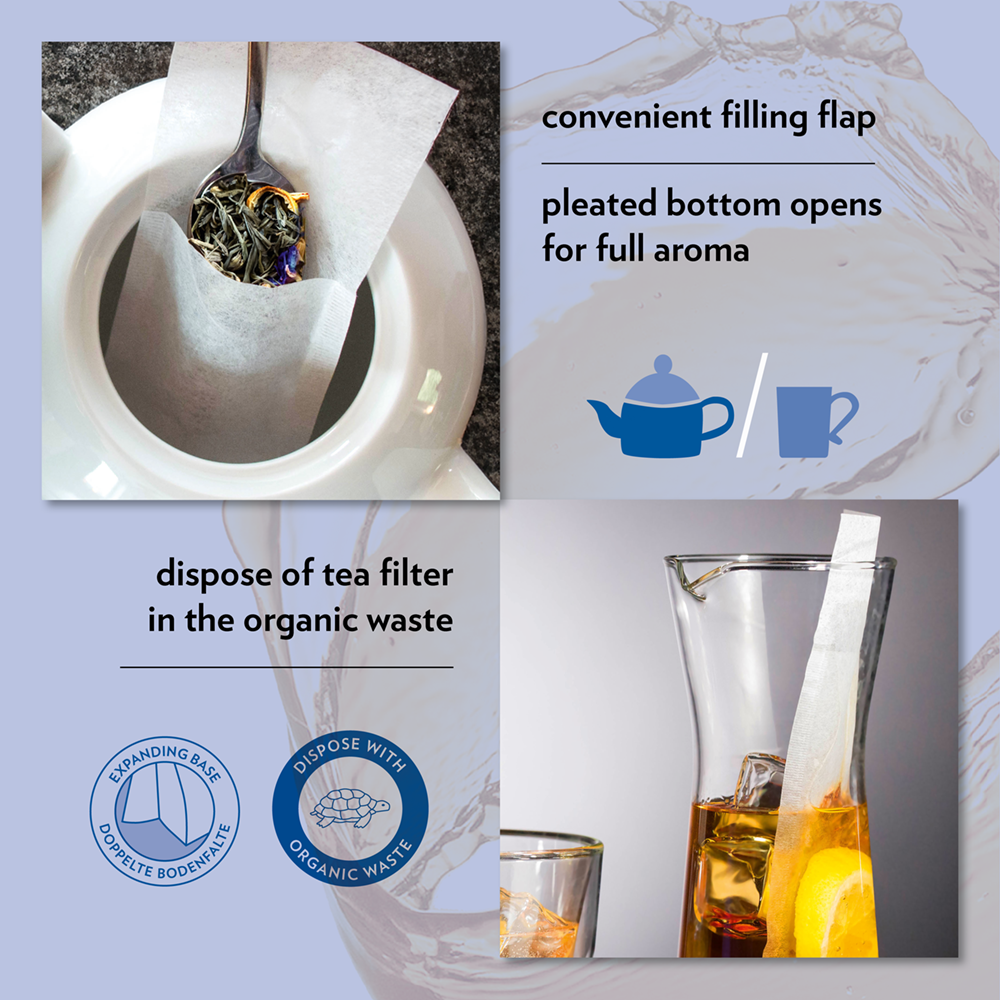 finum THEEFILTERS, Theefilters met gemakkelijk te vullen klep, biologisch afbreekbaar, doos van 40 Deze THEEFILTERS kunnen zonder filterhouder worden gebruikt, omdat de handige klep niet alleen het vullen van de losse thee vergemakkelijkt, maar ook het verwijderen van het filter na het zetten. Een eenvoudige en schone oplossing. Het filter kan ook als een “theezakje” worden afgesloten door de vulklep om te vouwen en te sluiten met een willekeurige filterhouder, b.v. doorprik het filter met de filterstaaf. De finum Filter Stick rust op elk standaard kopje of kan in een theepot worden gedompeld en met het puntige uiteinde naar boven worden geplaatst om na het zetten uit de pot te worden getrokken. De finum wegwerptheefilters zijn verkrijgbaar in verschillende maten – perfect voor elk kopje of grote pot.